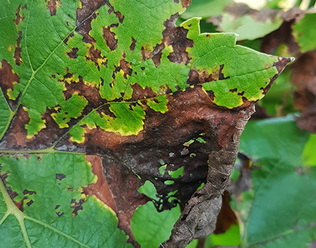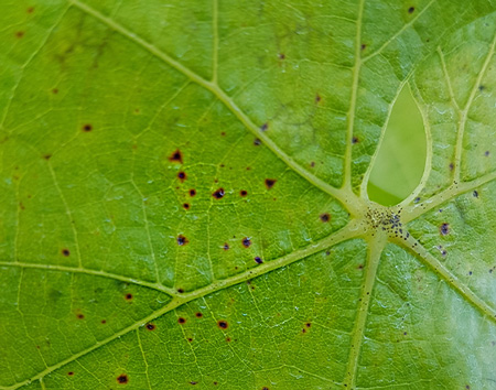 Sollte doch mal ein Pilz eine Piwi-Rebe befallen, schützt sich die Rebe durch eine so genannte Nekrosenbildung (zu erkennen an den kleinen Punkten): Sie verriegelt den Zugang zur Blattöffnung und lässt den Pilz absterben.